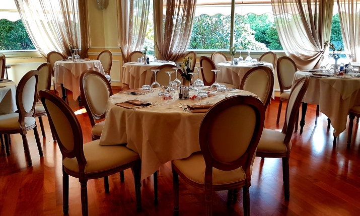 Le sale ristorazione si affacciano sul giardino e sono ideali per cerimonie e pranzi di lavoro.