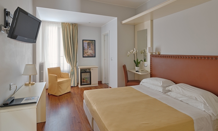 Camere dotate di climatizzatore regolabile, TV satellitare, minibar, telefono diretto, asciugacapelli, cassaforte, WIFI gratuito e in più per le Superior e le De Luxe terrazzo con vista panoramica sul mare, sulla piscina e sul parco esotico.
