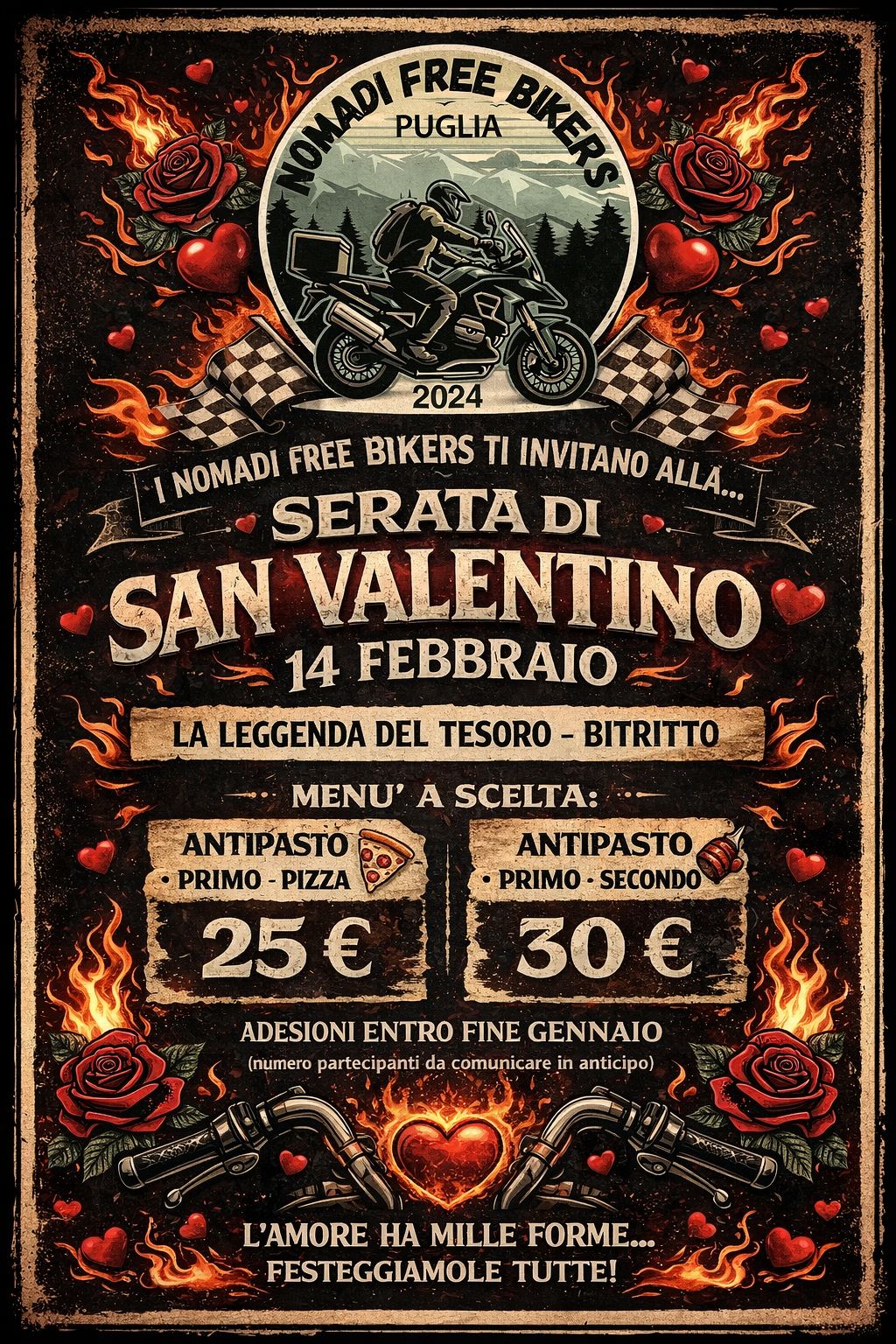 I Nomadi Free Bikers ti invitano a… Serata di San Valentino Una serata aperta a tutti: coppie – single – separati e non Perché per noi conta solo lo svago, la spensieratezza e la voglia di stare insieme tra musica | ballo | buon cibo Menù a scelta: 25 € → antipasto, primo e pizza ...Mache weiter